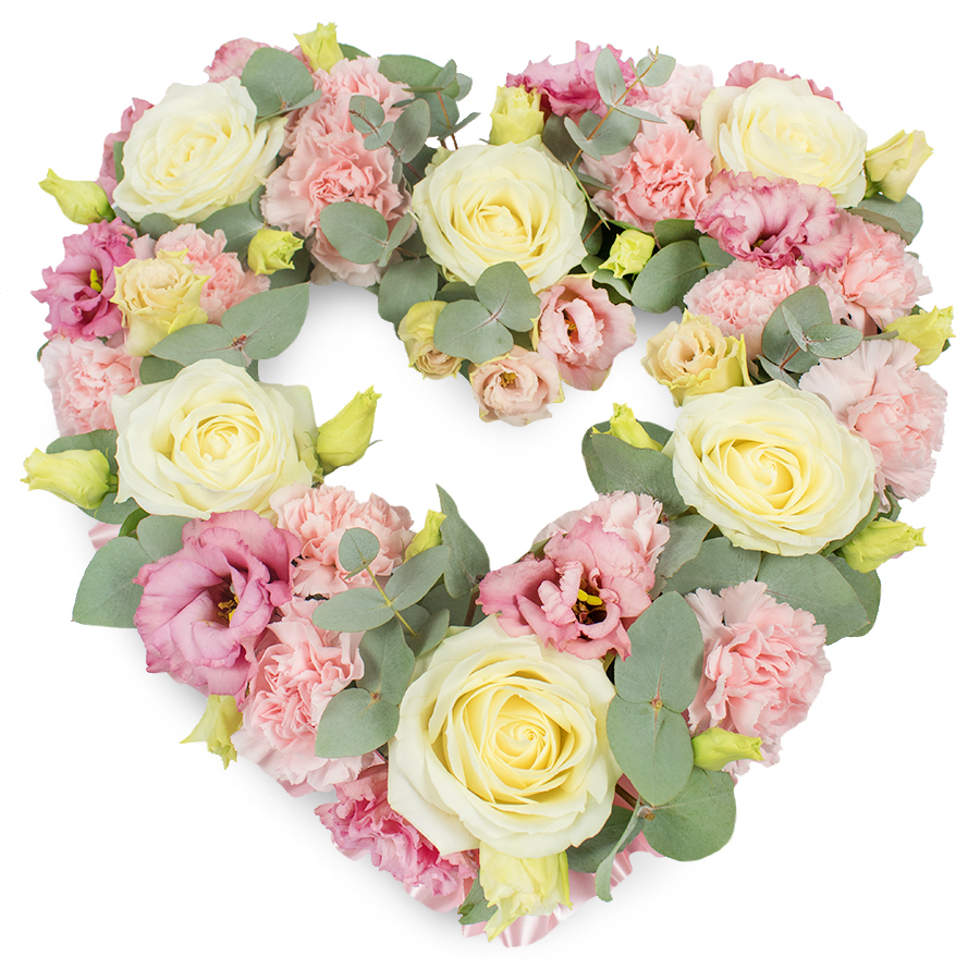 Our Sophisticated Open Heart Tribute Floral Arrangement is a perfect blend of elegance and emotion. Featuring a stunning combination of white roses, pink carnations, pink lisianthus, and eucalyptus, this bouquet is artistically arranged in an open heart shape to symbolize love and remembrance.